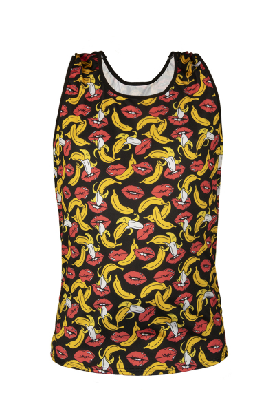Ce débardeur sexy est fabriqué en tissu noir au motif de bananes et bouches sexy.