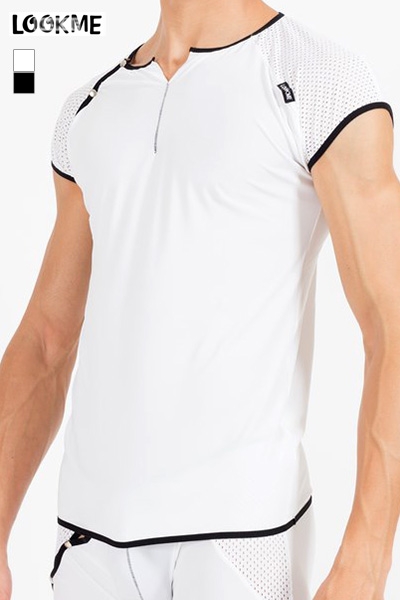 Tout dans ce modèle compose les effets de contrastes : les couleurs du tee-shirt et de ses bordures, les épaules en large résille et le corps de lycra, la couture de l'encolure, la fente fonctionnelle sur le coté de la poitrine fermée par des boutons pression.